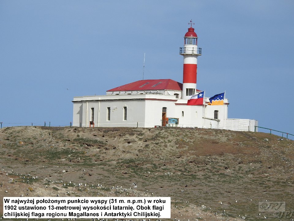 33 W najwyżej poÅożonym punkcie wyspy (31 m. n.p.m.) w roku 1902 ustawiono 13-metrowej wysokoÅci latarniÄ. Obok flagi chilijskiej flaga regionu Magallanes i Antarktyki Chilijskiej.